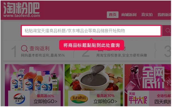 第一步:复制您想要购买的淘宝商品标题粘贴到淘粉吧网站首页的搜索框查询返利