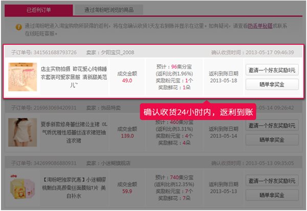 第四步:确认收货后淘粉吧就会发放返利
