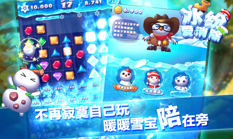 1、超萌雪人宠物前来助战,不同的雪人宠物拥有不同的技能。它们可以在游戏中帮助玩家消除宝石,轻松横推关卡。