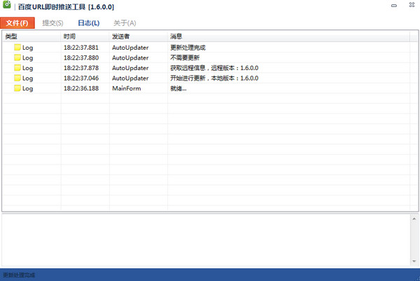 百度url即时推送工具是一款人气百度url即时推送小工具。该工具不仅小巧绿色,还可以帮助用户快速将网页推送给百度,也许运气好,百度一分钟即可收录提交的网页。百度url即时推送工具可以帮助用户快速将百度没有收录的、或者是新做的页面百度未抓取的方便的提交给百度的的url批量提交工具。