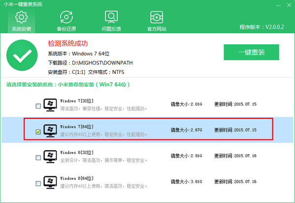 首先打开一键重装,软件会检测当前系统网络和系统情况,来判断您的电脑是否可以使用一键重判断完成,会出现4个不同的系统让您选择,(win7 32位 win7 64位 win8 32位 win8 64位)