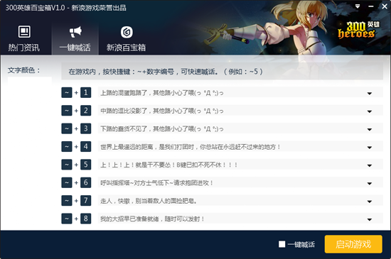 300英雄百宝箱是新浪游戏百宝箱所推出的300英雄游戏的辅助工具。300英雄百宝箱支持一键喊话功能,以及热门资讯等,让你玩游戏更畅快,更便捷。300英雄辅助工具就它了!