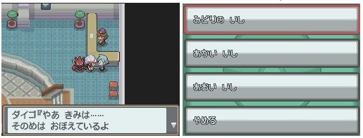 击败小智后前往关东地区的山吹市,在西路夫公司右上角的柜台可以见到方缘地区的冠军大吾先生。他和以前一样还是个石头控,会拿出三块美丽的石头让你挑选。如果你身上有空位的话,他会根据你选择的石头颜色不同,会送给你木守宫,火雉鸡,水跃鱼其中一只。对应关系为:“みどりのいし绿色石头”木守宫,“あかいいし红石头”火稚鸡,“あおいいし蓝石头”水跃鱼。