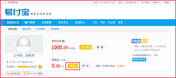 1)登陆易付宝账户->【我的易付宝】->【转入】;