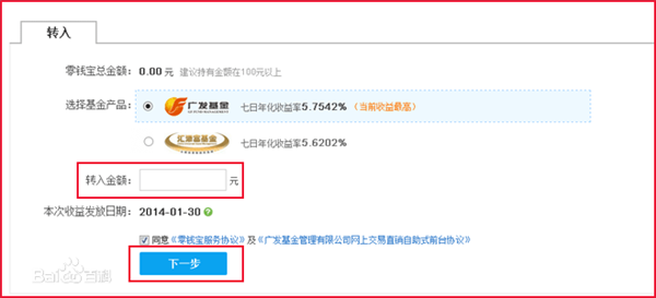 2)首次转入需要选择基金公司,输入转入金额,点击【下一步】;