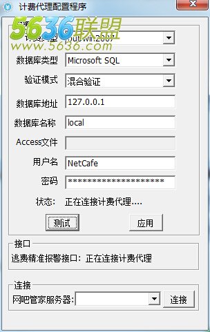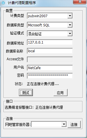 状态栏上的第二个图标即代表计费代理工具的连接状态。在启用网吧计费代理工具时,选择网吧目前使用的计费类型,验证模式建议为“混合模式”,然后输入数据库的用户名和密码,点击测试验证或者直接点击应用保存设置。连接成功后,最下方会显示已连接网吧管家服务器的地址。