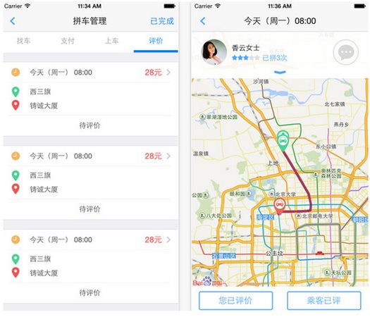 微微拼车在用户输入起点地理位置以及终点的地理位置之后,系统会计算出打出租车需要的价格,用户可以参考这个价格自行出价。再点击“我要拼车”,司机接单后,用户再预先将费用结清,双方的交易算是初步达成,之后就可以联系接乘的事情了。