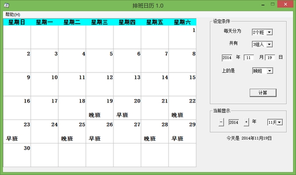 每天分为3班,共有5组人,在2014年11月19日上的是早班,从这一天开始向后计算。