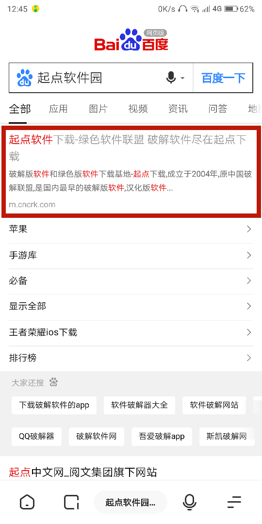 1.打开浏览器,百度搜索起点软件园,点击第一个进入