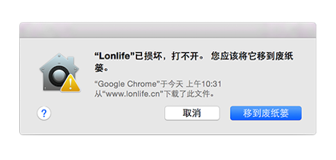 如果遇到提示“Lonlife”已损坏(如下图),请做以下修改:系统偏好设置>安全性与隐私>通用>允许从以下位置下载的应用程序:任何来源(选择它,打上点)