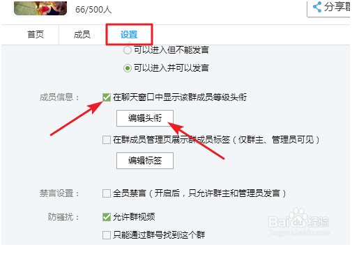 在群管理界面,点“设置”,将“成员信息”里的“在聊天窗口中显示该群成员等级头衔”前的勾打上,聊天窗口中群成员的头衔就会显示了。
