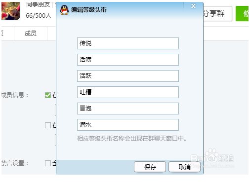 接上一步,点击“编辑头衔”按钮,就会弹出“编辑等级头衔”窗口。从“潜水”到“传说”(默认的名称),依次对应群等级的1到6级。等级头衔名称可以修改。