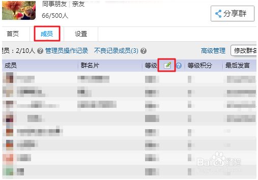 在“成员”栏目下有“等级”一项,点击等级后的图标同样可以对群成员头衔名称进行修改。