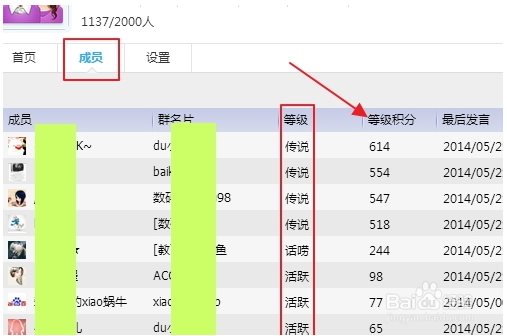 在出来的界面我们就看见了等级和积分的情况,点击“成员”可以找到自己的名字进行查看。
