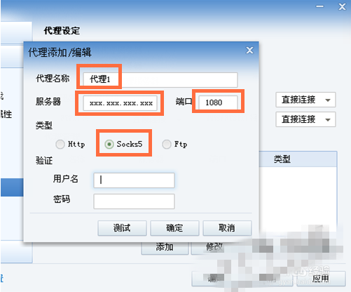 4、然后在弹出的窗口中,按照里面的要求将自己准备好的代理服务器信息填写到里面,点击测试,测试通过之后我们就能点击确定使用代理了。