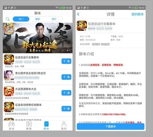 4、此时你已经进入呱呱助手的界面,可以在脚本页面里找到你需要的脚本。点击下载脚本!(我们以征途脚本为例)