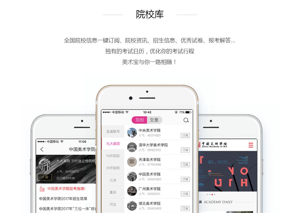 以全新的美术作品评画、视频教学理念为引导,以移动互联网的视角解读美术教育。从最基础的理论学习到考前应试学习,全面构建多层次的美术学科知识体系,采用领先的视频流媒体技术和语音点评技术实现交流互动。在这里,全国美术名师,各画室神一样的主教,各出版社强推的作者,各美院历年的状元,所有传说中的牛人都是你的老师。央美、清华、国美等各大美院阅卷老师帮你指明学习方向,精析历年考题,预测当年考题。订阅院校随时掌握政策动态,央美简章都说了啥,国美考点在哪里,清美文化课要多少分,一键订阅它,你随时就能知道了。