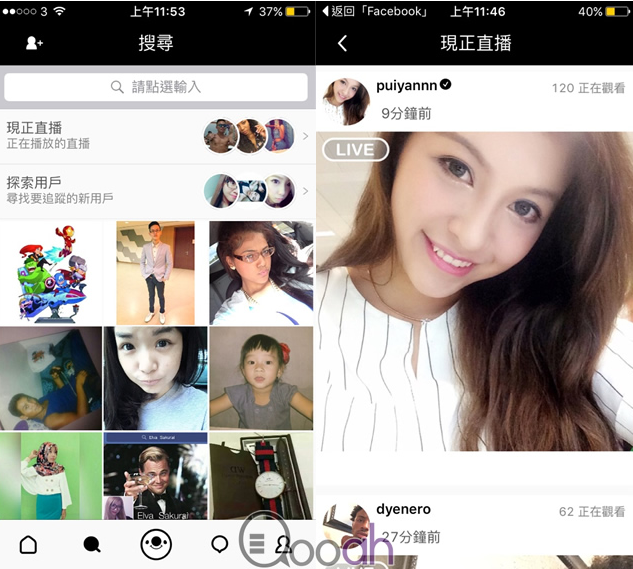 就如标题所言,「17」只是抄了Instagram加上「Live」功能的App,所以此App重点之处亦当然只有这个功能。在搜寻分页中,大家除了可以找到其他用户外,就是可以看到有谁正在做直播。相信大家都不难发现,很容易找到一些正妹帅哥在做直播,这正是此App可以极速爆红的原因之一。