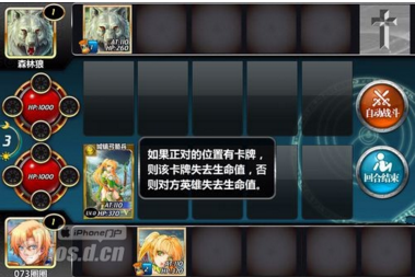 卡牌上阵之后,如果正对的位置有卡牌,那么该卡牌失去等同于你攻击力的血量,如果没有,则敌方主将丧失生命值,生命值在整个界面的左侧。