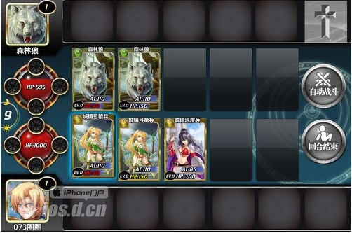 具体战斗为回合制,根据卡牌位置决定出手顺序,玩家无需进行过多操作。当一方生命值降为0时游戏结束。即使完全不懂规则也没关系,画面右侧有自动战斗按钮,点击之后就可以完全由电脑操作。