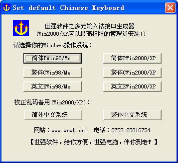 中国独创的EXE外挂式输入法,可以在中英文繁简体Win95、Win98、WinNT、Win2000、WinXP、2003及外挂中文平台中使用。即是说只要能看到中文的系统,都可以用万能五笔输入汉字,和一般操作系统的内置输入法往往有所不同。如在一些特殊的软件或操作系统中,用其他的内置式输入法都无法上屏或有乱码,而用万能五笔却能正常上屏汉字。