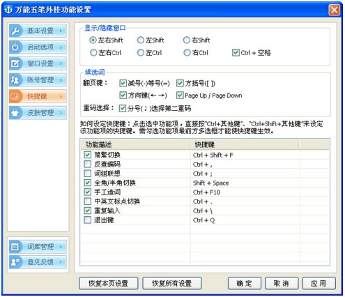 (六)、由于历史的原因,大陆地区和香港、港门特别行政区和台湾地区在中文的编码上是不同的,大陆采用的是G B 码,而香港、港门特别行政区和台湾地区采用的是B I G 5 即大五位码。这样给交流带来了很多不便,不过,万能五笔在设计时考虑过GB 和B I G5 码的问题,通过它既能输入GB 简体字,又能输入BIG5 繁体字,甚至还可以简体输入繁体输出。你只要点设置按钮,在菜单中选“快速切换”,钩选“繁体”即可实行繁体输出,万能五笔8.0测试第五版就可以这样了。
