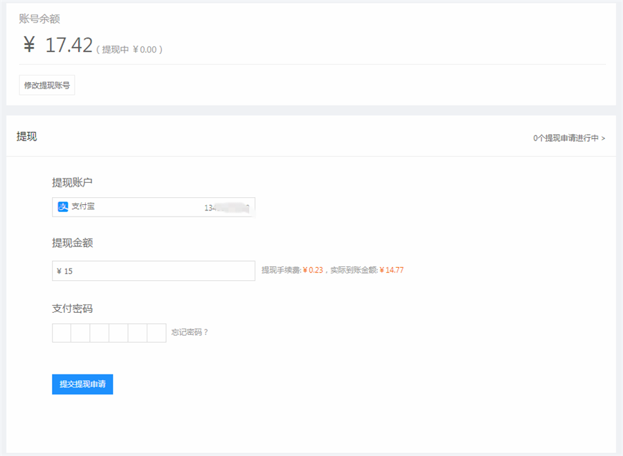 如果是第一次提现,需要填写提现账号。请仔细填写您的支付宝账号的姓名,如果账号信息错误将无法完成提现。
