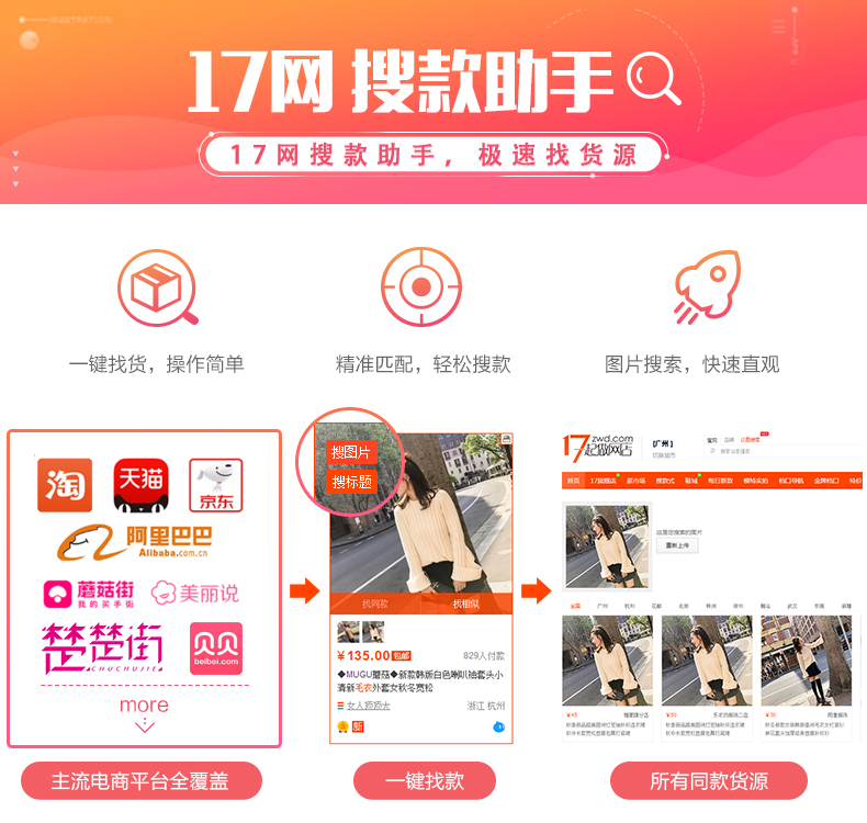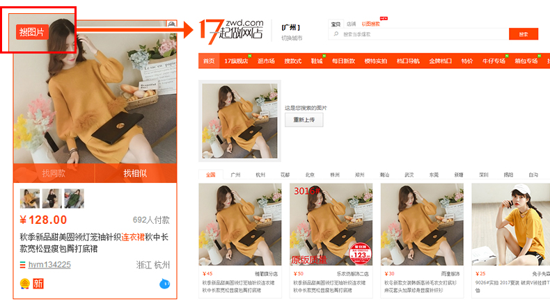 1、将鼠标停在心仪款式的单个图片上,点击【搜图片】按钮,即可在17网上寻找款式相同或相似的货源。