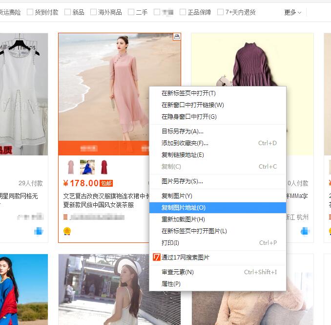 2、在你想要搜索的图片上点击右键,点击【通过17网搜索图片】按钮,即可在17网上寻找款式相同或近似的货源。
