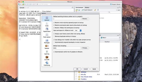 RStudio是基于Mac平台上的一款非常好用的R语言开发工具,这款工具功能强大,操作简单易上手,RStudio把常用的窗口都整合在一起,开发者不用在命令行和绘图窗口来回切换,只需在同一个操作界面就可以完成的编程工作。