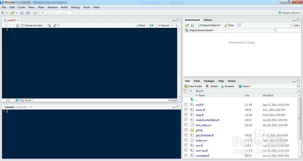 从上面的界面和操作可以看出,单单使用R自带的gui界面,难以进行方便快捷的操作,因此我们需要使用到R的辅助UI软件RStudio。同样地我们安装好并打开它。我们看到RStudio界面比R自身内容丰富很多,整个界面切成多个模块进行同步操作显示,脚本区、控制台区、文件区非常清晰易用。