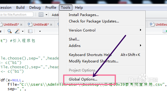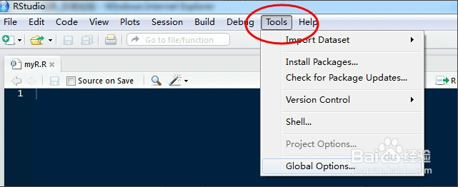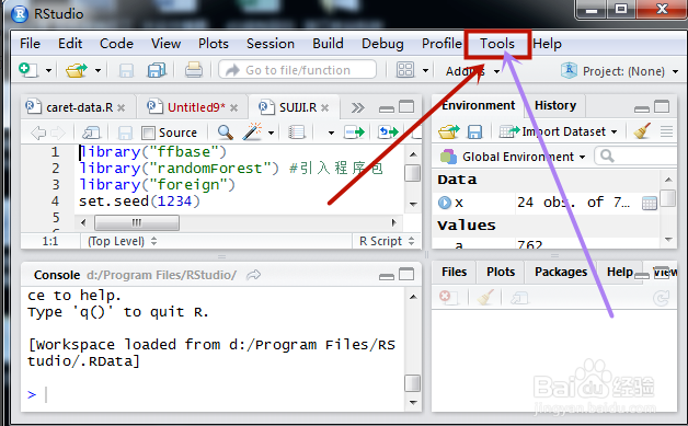 点击打开R语言后,点击上方菜单栏-Tools工具,如图所示