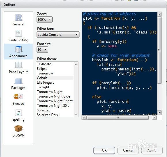 R软件自带的有写脚本的工具,可是我不是很喜欢用(并不是说不好哈),我更喜欢用RStudio(网上还有Tinn-R,RWinEdt等)。因为我觉得其本身比较方便,另外在编程的时候有些功能很方便。下面这个界面是我修改了主题的,下面我将介绍如何修改主题,来方便编程。