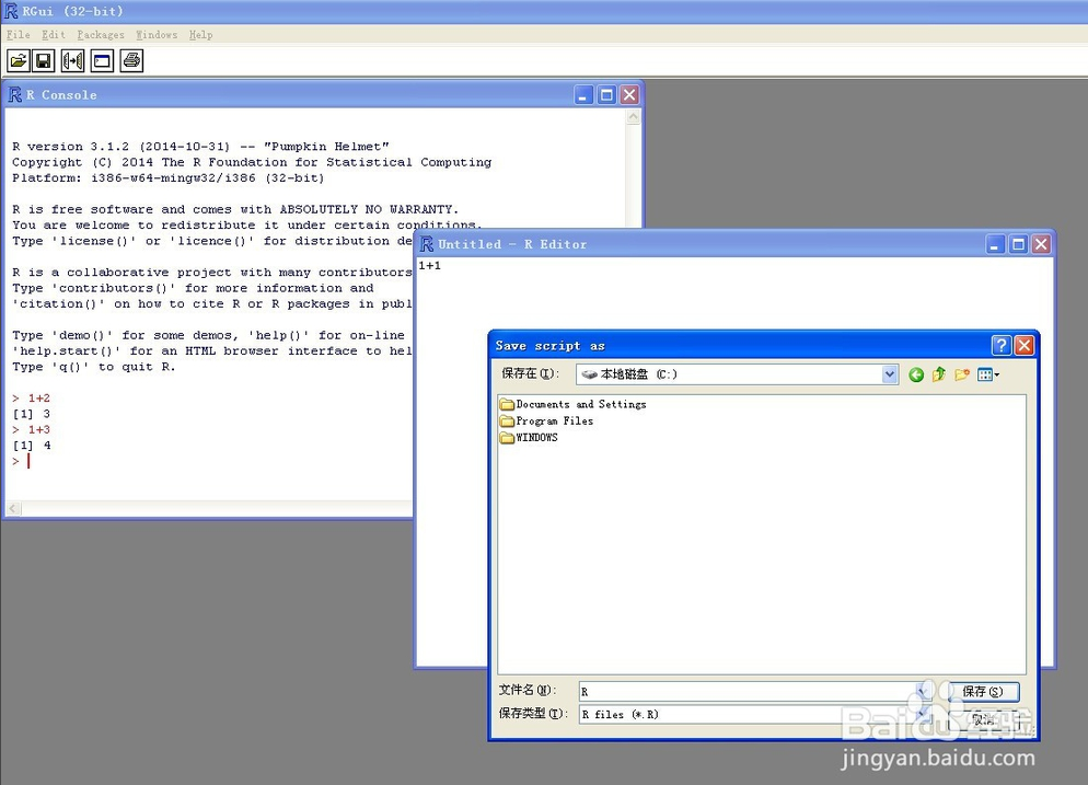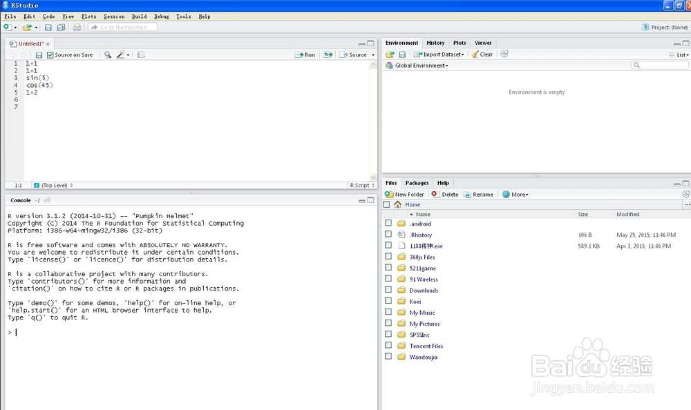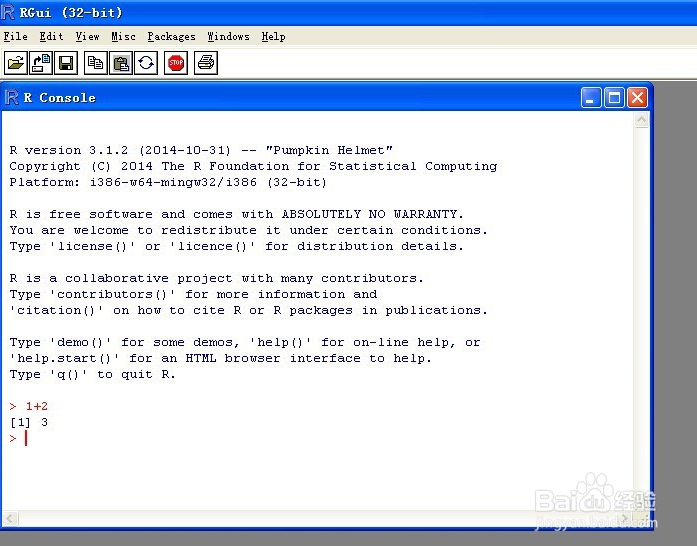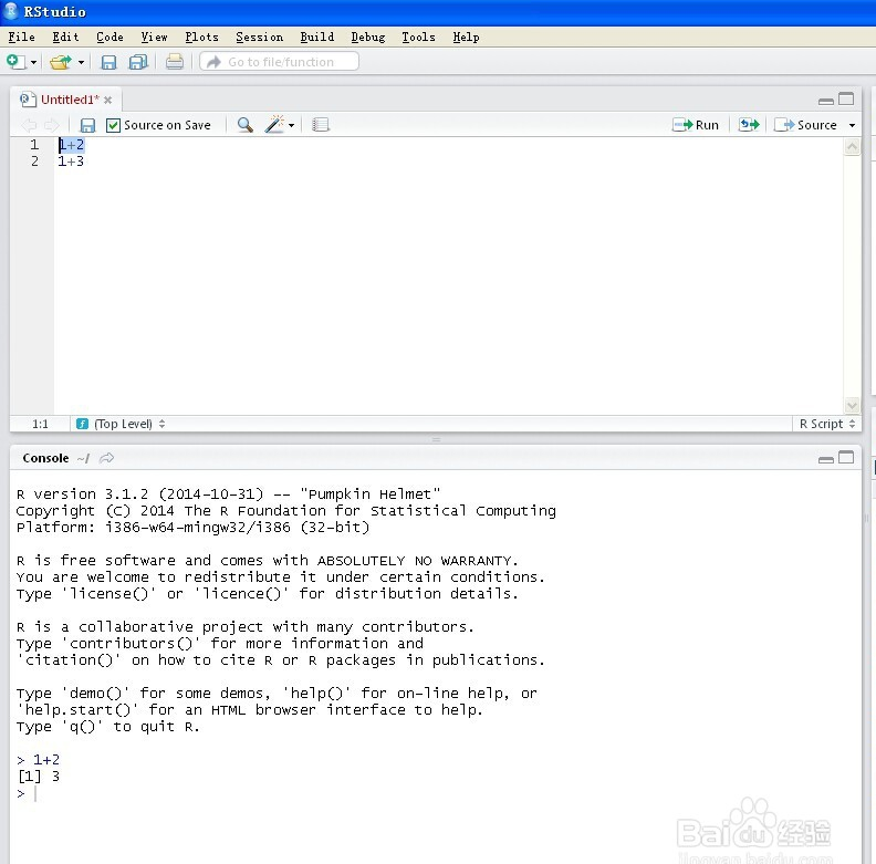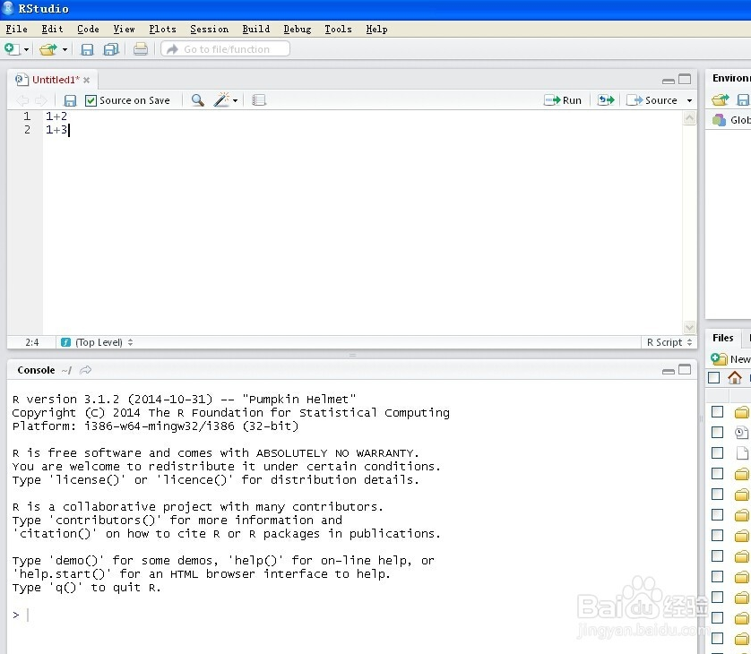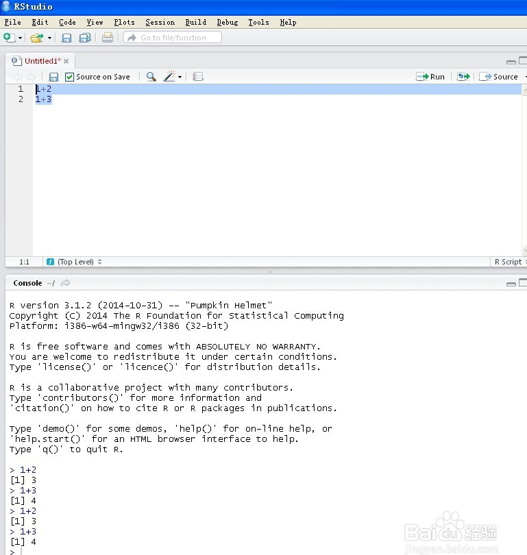 R Console 控制台的使用:我们可以在R Console 控制台内输入脚本进行运算、绘图和分析、如我们输入运算:1+2,按回车键。可以看到系统在下一行内弹出了一个3,有点类似于cmd的操作。