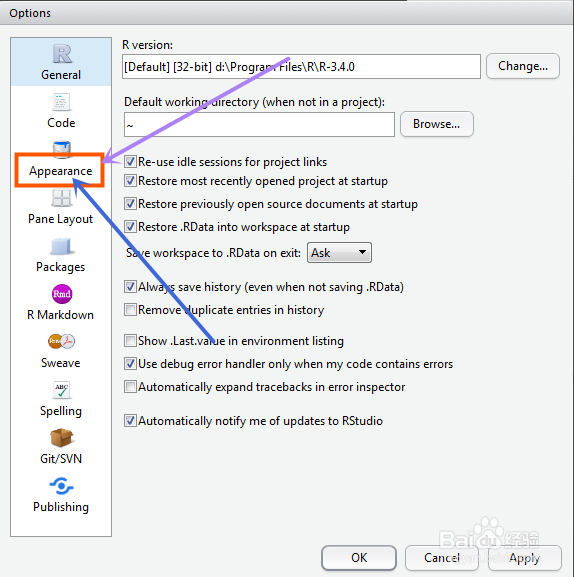 在Global Options(全局选项)中,再点击左侧第三个菜单-Appearance(外观),进入设置软件外观,如图所示