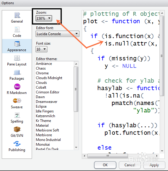在Appearance(外观)设置中有三个选择:zoom控制代码的显示比例,如图所示选择显示150%,代码明显比以前放大了很多。