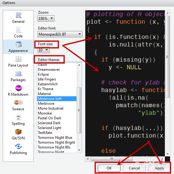 选择aperance,里面就可以更改字体大小,型号以及主题了,不同的主题会在右边的窗口中呈现。
