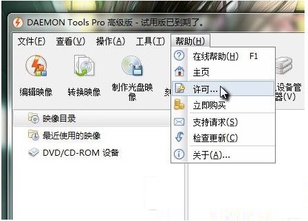 8、这时,我们可以打开 DAEMON Tools Pro(虚拟光驱) 程序了!在软件界面,我们点击 帮助——许可,接下来选择更改