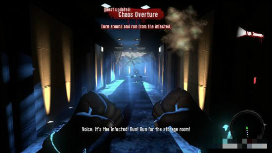 进入电梯里后缆线突然断掉,电梯落到了最底层,出来之后顺着指示来到这条走廊,前面可以看到僵尸,