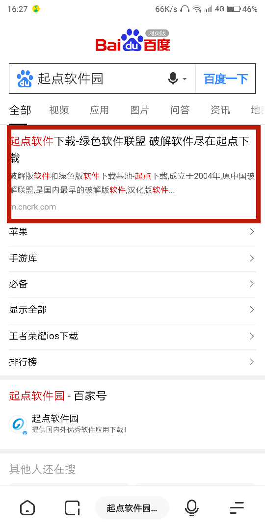 1.打开浏览器百度搜索起点软件园,点击搜索结果第一个进入起点软件园