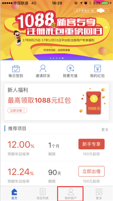 出借新手标操作指引——APP端1、打开手机APP,点击我的账户;