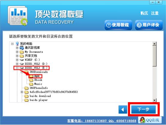 二,点击进入误删除文件,选中要恢复的文件所在的硬盘以及文件夹,点击下一步