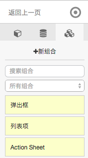 进入组合面板后,可以看到,墨刀已经为你内置了一些常用的组合控件,包括弹出框,列表项等等,要只用这些组合,只需要直接拖拽到工作区即可,你也可以复制这些系统内置组合来定制你的自定义版本.