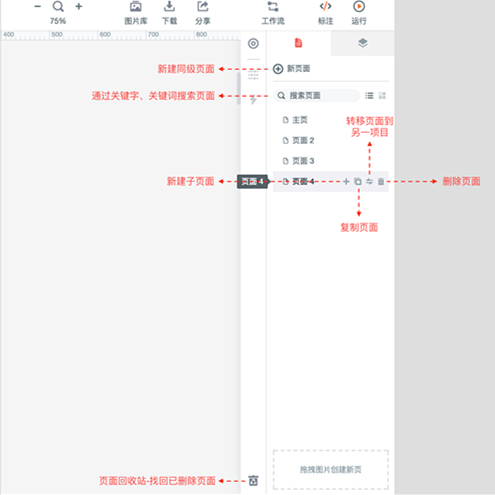选中特定页面后,可以看到「添加新页面」、「复制」、「项目间页面转移」、「删除」按钮,进行更多操作。在页面列表左下方,有「页面回收站」入口,误删除的页面可以在回收站中找回。