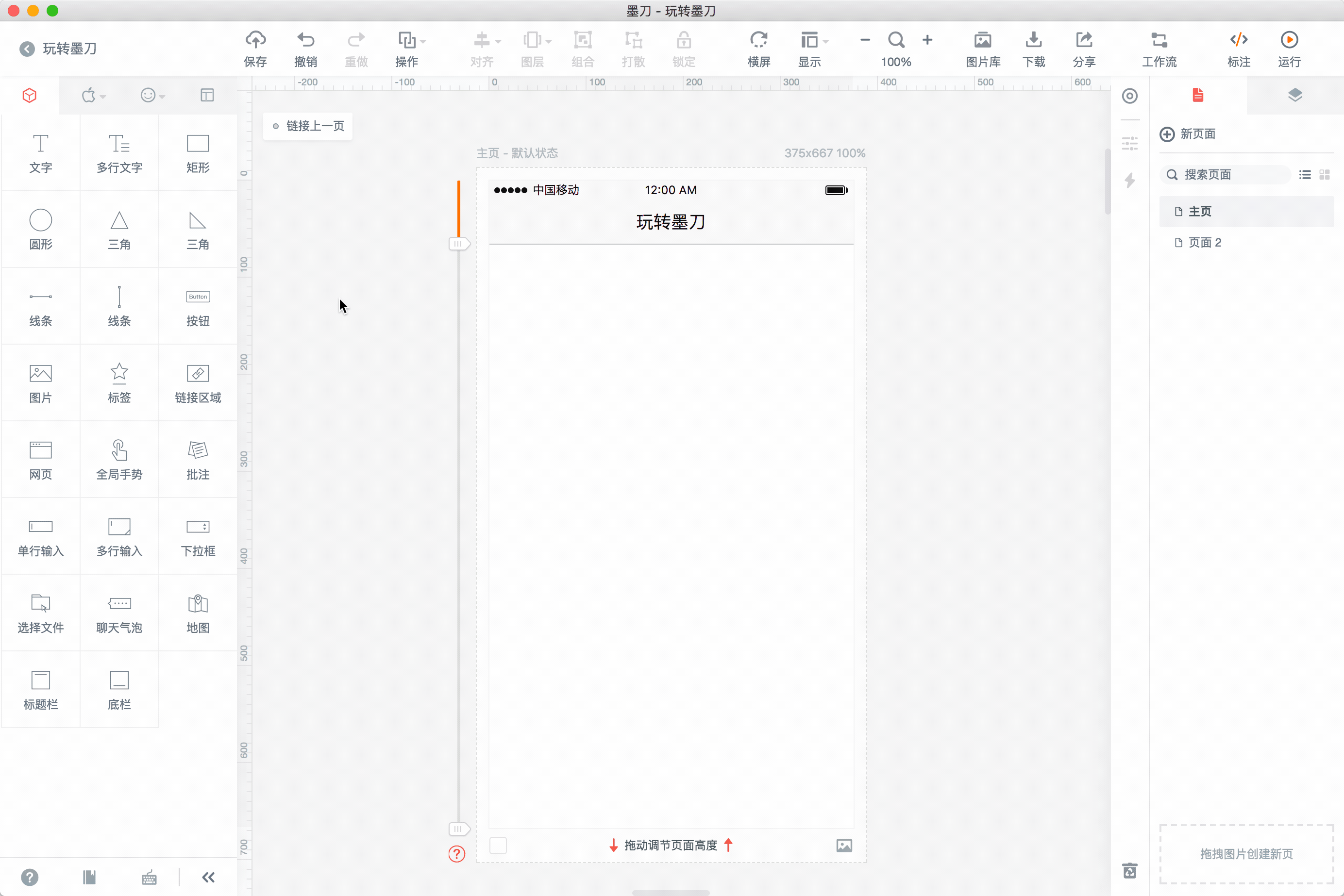 墨刀创建页面内容非常的简单:从左侧控件区拖拽控件到页面设计区,然后在属性设置面板和顶部工具栏中编辑其细节就可以了。