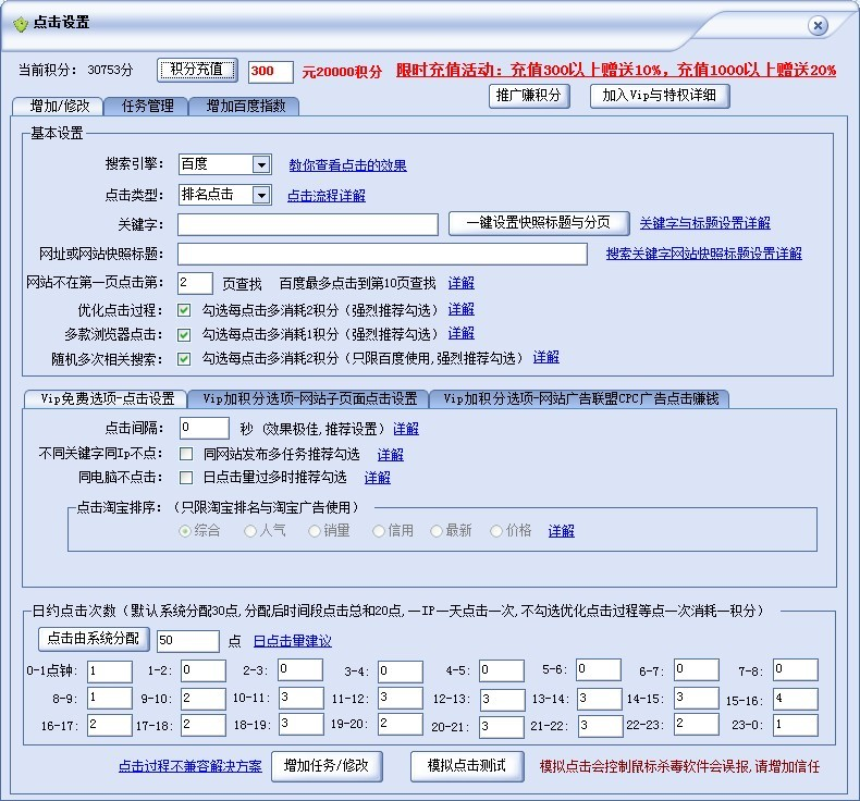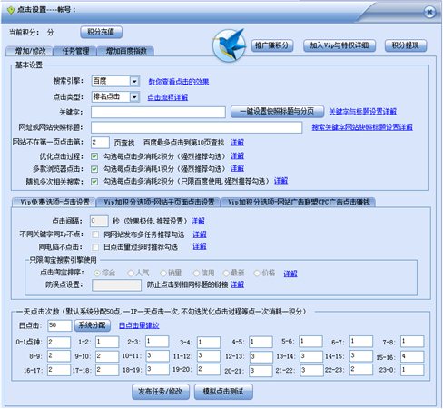 网站排名大师免费版采用互相点击的原理,挂机帮别人点击获得积分(一个IP一天只能点击一个关键字一次),当积分大于200可以添加网站让众多网友挂机帮你点,网站被点击后消耗积分。大家互利共赢,没有任何损失。