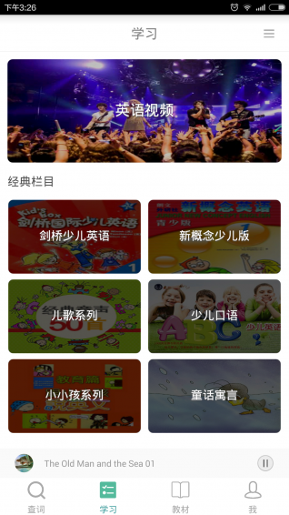 1:全新的界面改版,采取首页、学习、教材三个分类进行布局,大卡片设计,更加符合儿童英语学习2:整理大量儿童英语资源,从单词发音、童话故事到儿童歌曲等