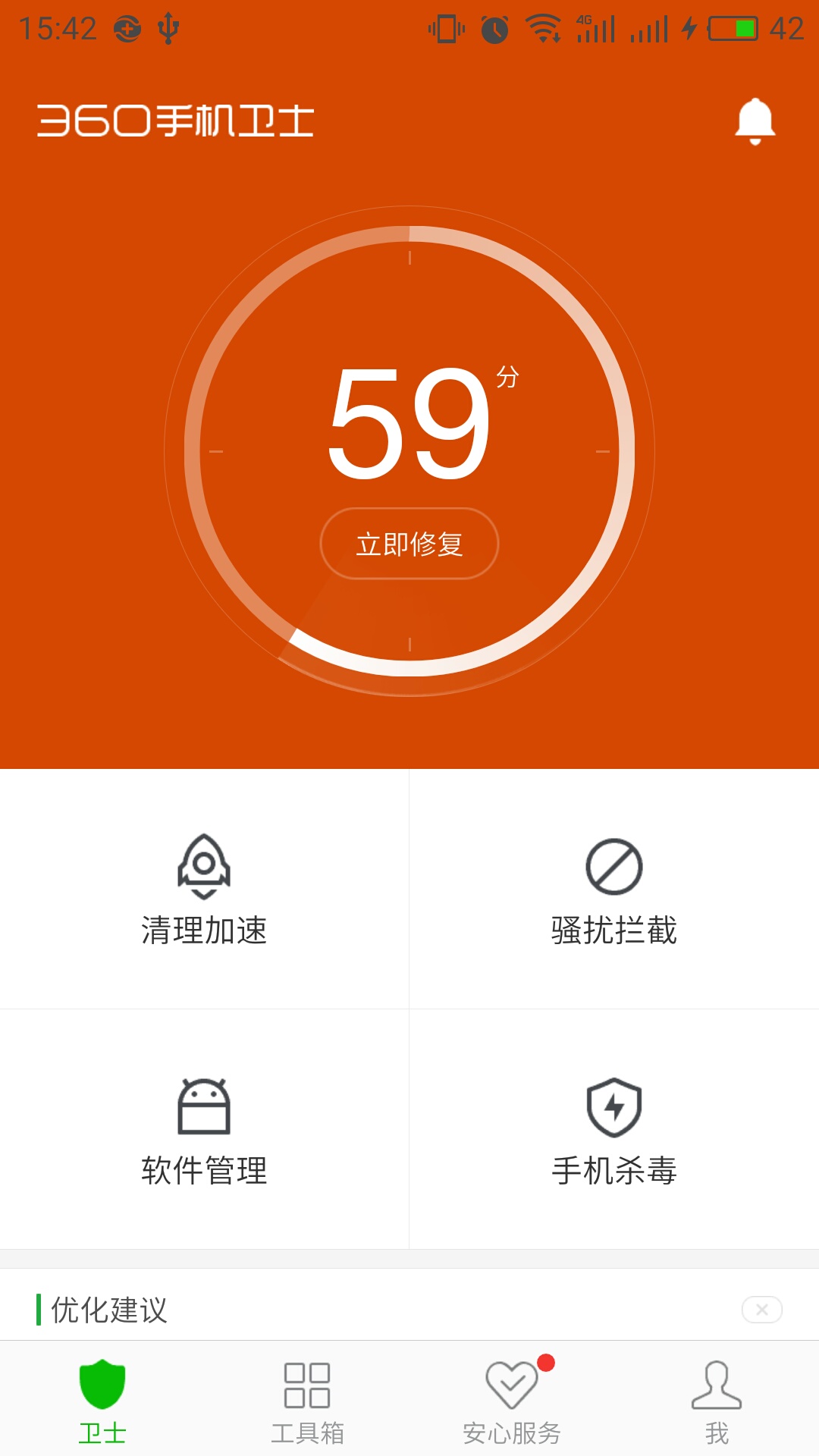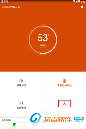 1、打开“360手机卫士”客户端,进入即可检测手机评分,可一键修复;
