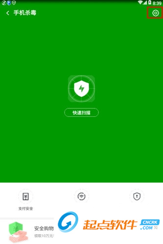 2、在360手机卫士的“手机杀毒”界面中,点击界面右上角的“设置”按钮;
