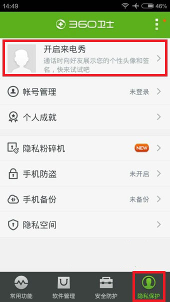 1、进入360手机卫士之后,点击【隐私保护】,找到【开启来电秀】。